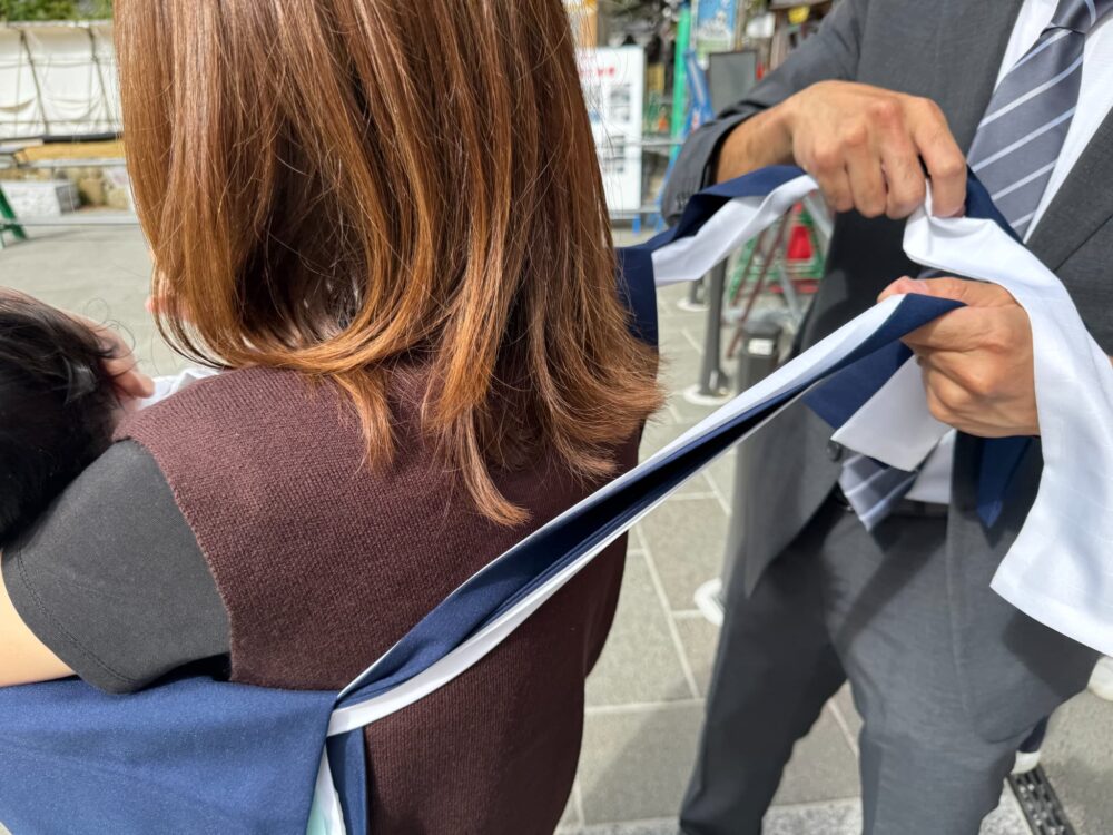 ポイントは、①赤ちゃんが苦しくないように位置を調整すること ②産着の柄がしっかりと前に来るようにすること ③着用時は誰かに手伝ってもらうこと です。