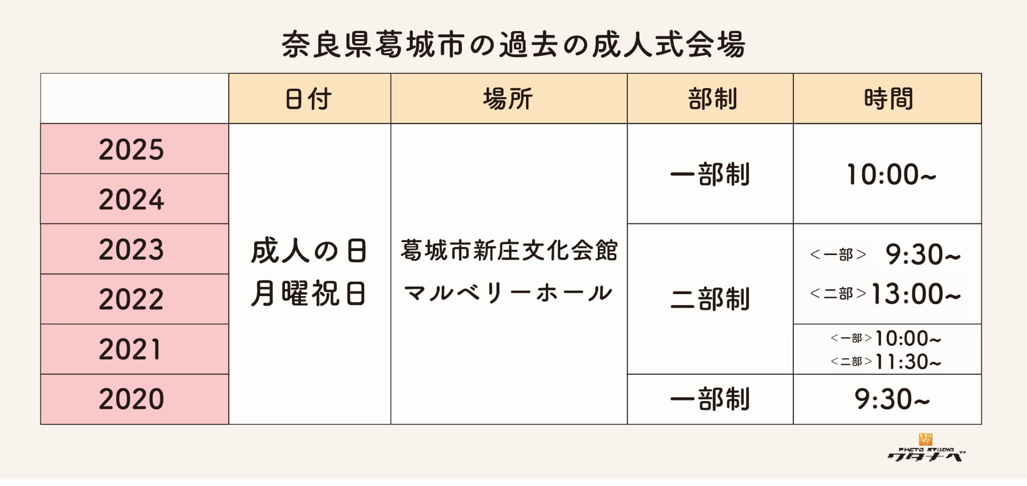 特に変更の無い点としては、成人の日の月曜祝日に「葛城市新庄文化会館 マルベリーホール(奈良県葛城市南藤井70-1)」にて成人式/二十歳の集いが行われています。