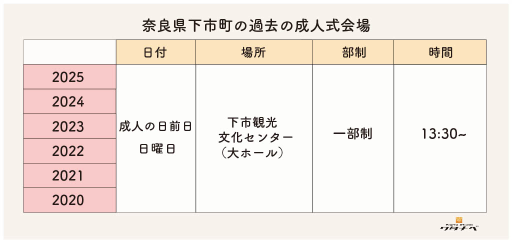 毎年、成人の日の前日(日曜日)に「下市観光文化センター 大ホール(奈良県吉野郡下市町下市3071)」にて一部制で13時30分から開催となっております。