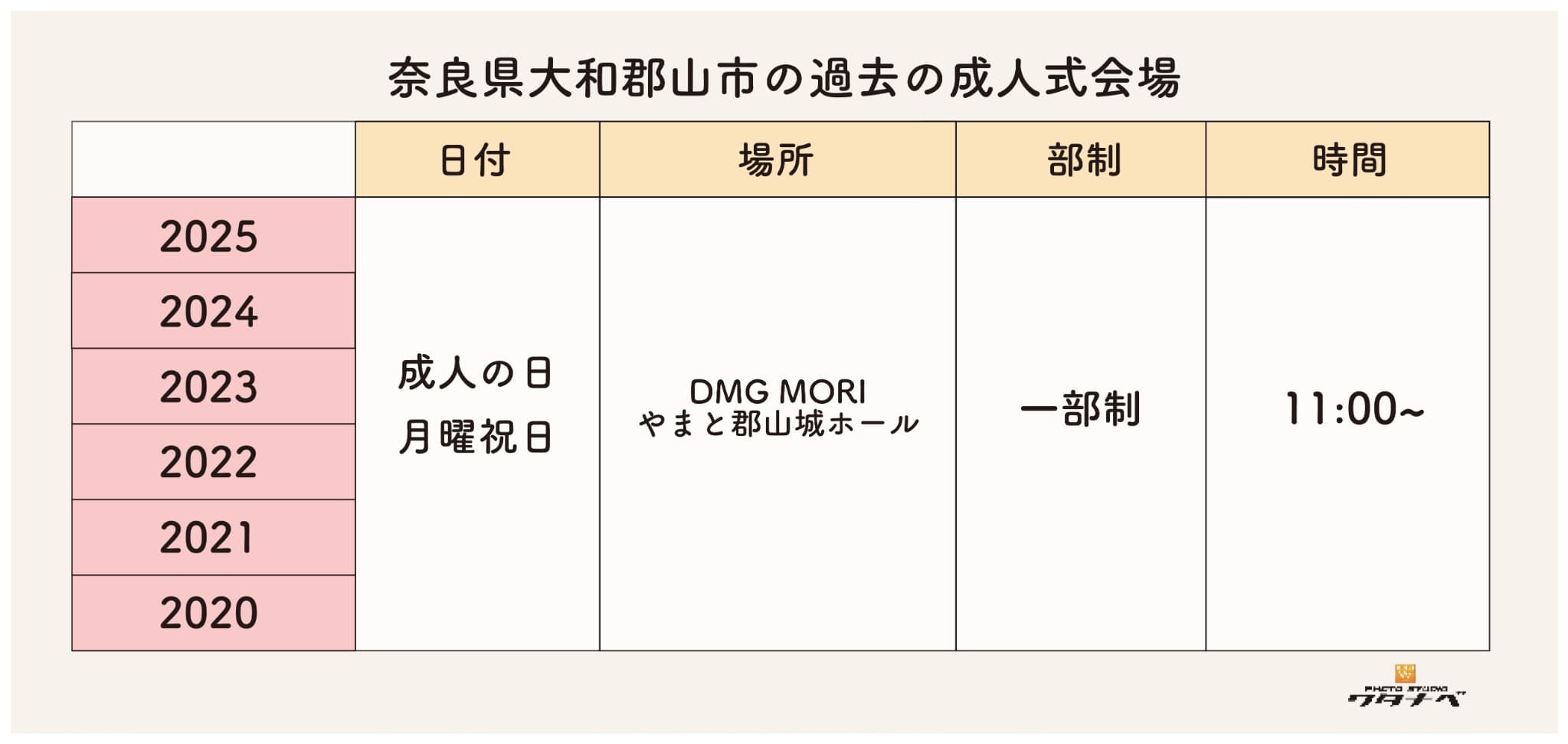 過去6年間同じ会場「DMG MORI やまと郡山城ホール」で成人の日の月曜祝日に一部制で式が行われています。