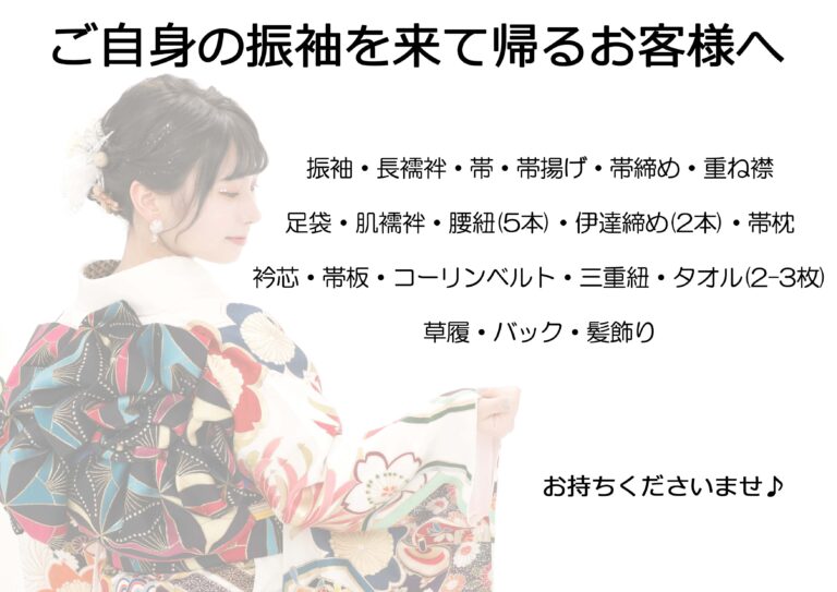 着たまま帰られる場合は、着付小物なども一式ご用意ください。